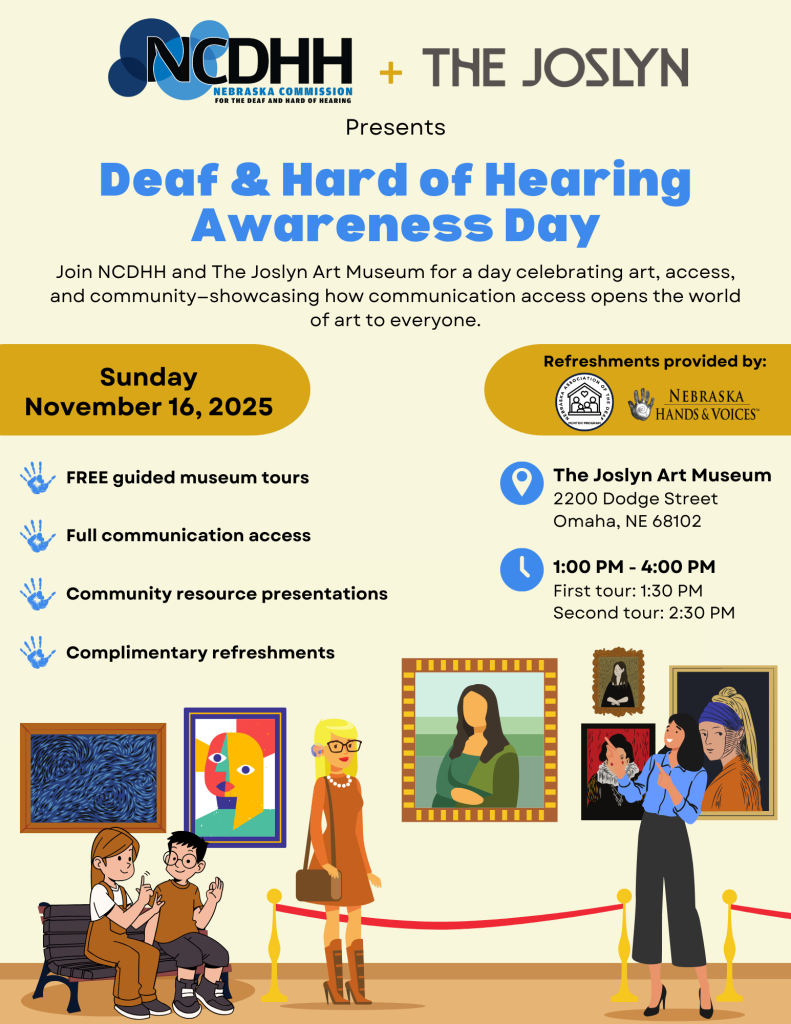 Join the Nebraska Commission for the Deaf and Hard of Hearing (NCDHH) and The Joslyn Art Museum for a day celebrating art, access, and community. Deaf & Hard of Hearing Awareness Day showcases how communication access opens the world of art to everyone.